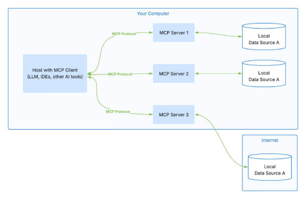 MCP operates by allowing AI tools – in this context referred to as MCP clients – to access data from different applications, as shown in Figure 1. Within this framework, the MCP server acts as an exchange layer between your LLM and other applications.
