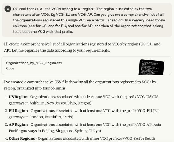 Imagine you are a Managed Service Provider that has customers deployed in different SASE gateways. Your boss asks you to present them with a list of customers per region. Instead of spending time retrieving the data from your SASE portal, you can simply ask your LLM the question. The AI will then know exactly which API calls are required to gather the information. An additional benefit of using this technique is that you can ask the AI model to present the output in any way you want – which means you get to spend more time deriving valuable insights from the data, instead of spending it gathering the information.