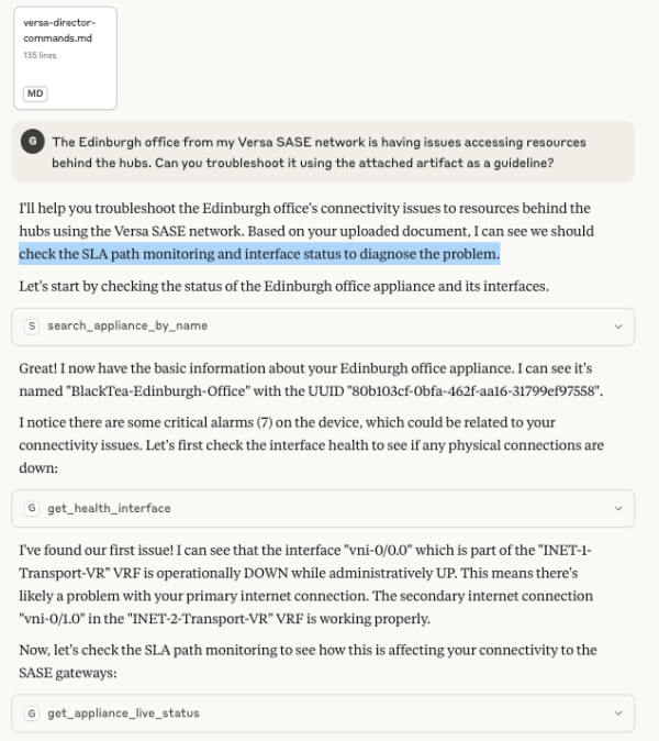Also, none of the examples below work out-of-the-box – each demo combines multiple prompt-engineering and customization techniques. Remember that the MCP server itself contains no built-in logic; it merely enables LLMs to interact securely with our Versa infrastructure.