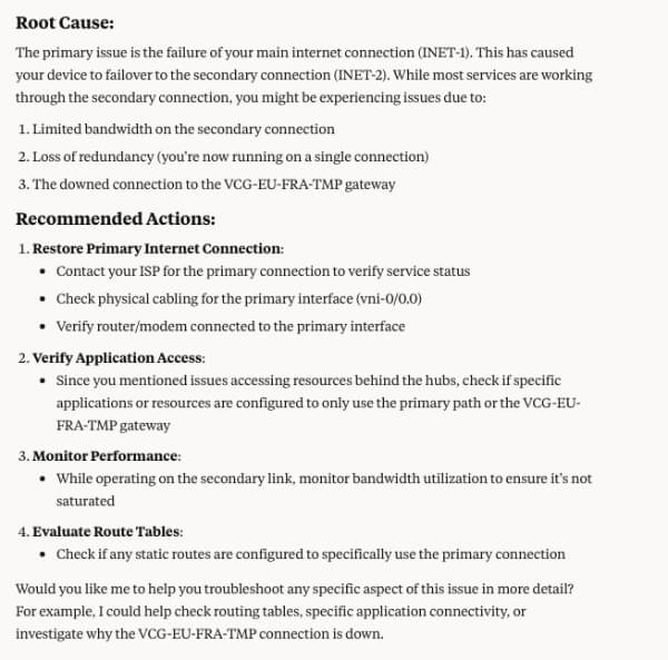 To unlock even greater value, you can develop a bespoke model by creating a custom GPT. Such a model would be fine-tuned to your own runbooks, operational procedures, and historical incidents. This dedicated assistant will surface context-aware recommendations tailored to your network’s architecture and team’s workflows.