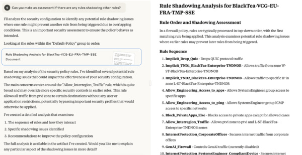 For this use case, prompt engineering also brings a lot of value. We can use it to give the model our audit requirements to identify rule conflicts, spot unused entries, and highlight overly permissive access.