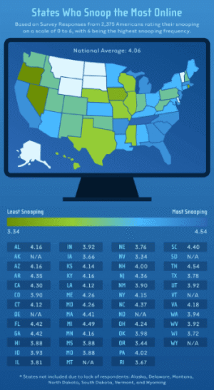 So, which states are snooping the most? Tennessee rated 11.9% above the national average with the highest score of 4.54. Along with Tennessee, Michigan (4.49), Florida (4.42), Georgia (4.42), and Massachusetts (4.41) are the top 5 states that snoop online the most.