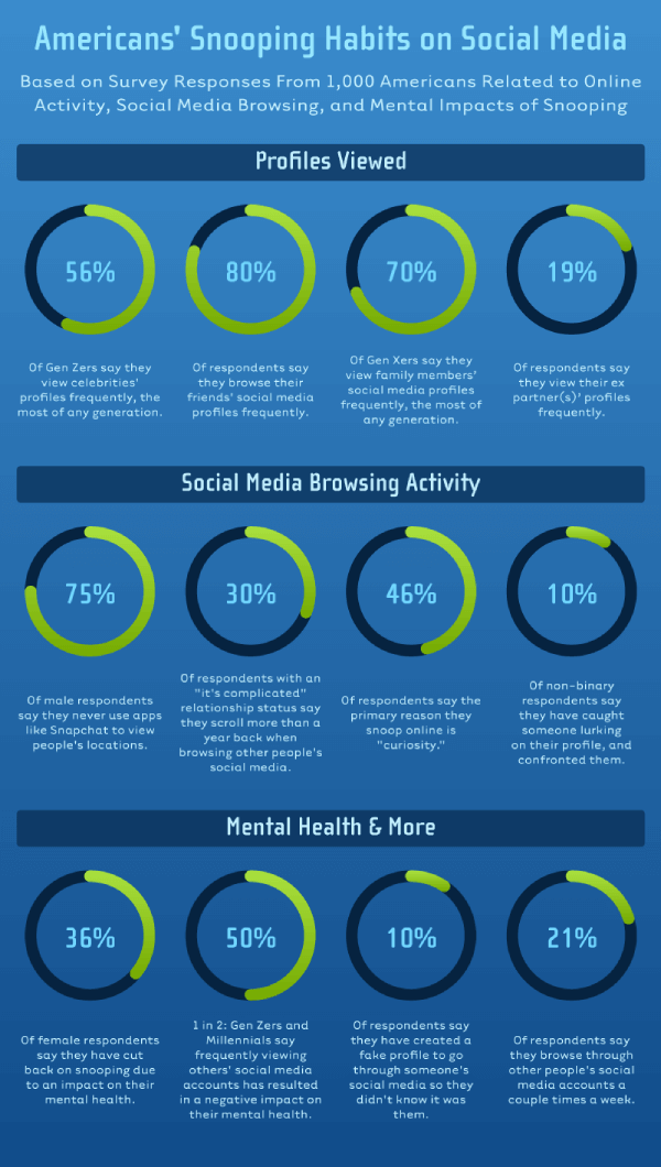 Respondents were also asked a series of snooping-related questions like the applications they use most to snoop, who they’re viewing the most frequently, and more. Our goal was to learn more about America’s online sleuthing habits and online activity. What do people view on social media? How often do they view others’ profiles? What applications do they use to snoop online? Does internet browsing have an impact on mental health?