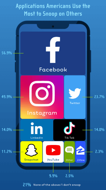 A lot of Americans find themselves snooping on professionals on LinkedIn (14%) and content creators on Tik Tok (14%). Snapchat (11.2%), YouTube (9.9%), and Zillow (2.3%) were also included.