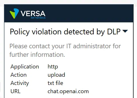 Versa GenAI prevents sensitive data from being uploaded into Generative AI tools (e.g., ChatGPT) and limits shadow use cases of GenAI. This ensures compliance with data protection regulations and safeguards against data leaks.​